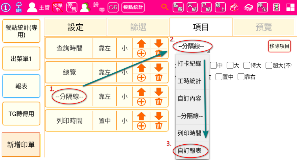 請到印單設定裡面–>找到報表–>選擇【項目】