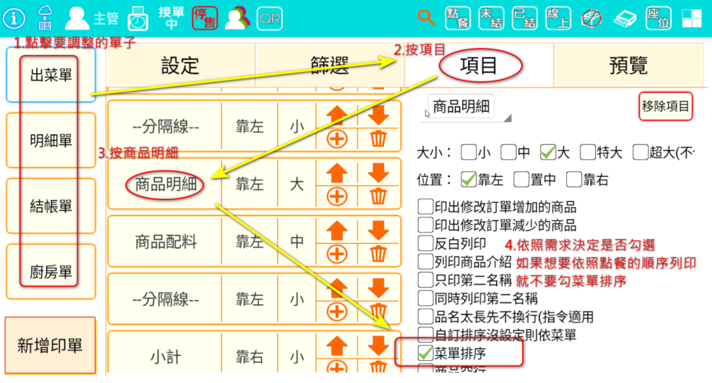• 出菜單的商品排序調整